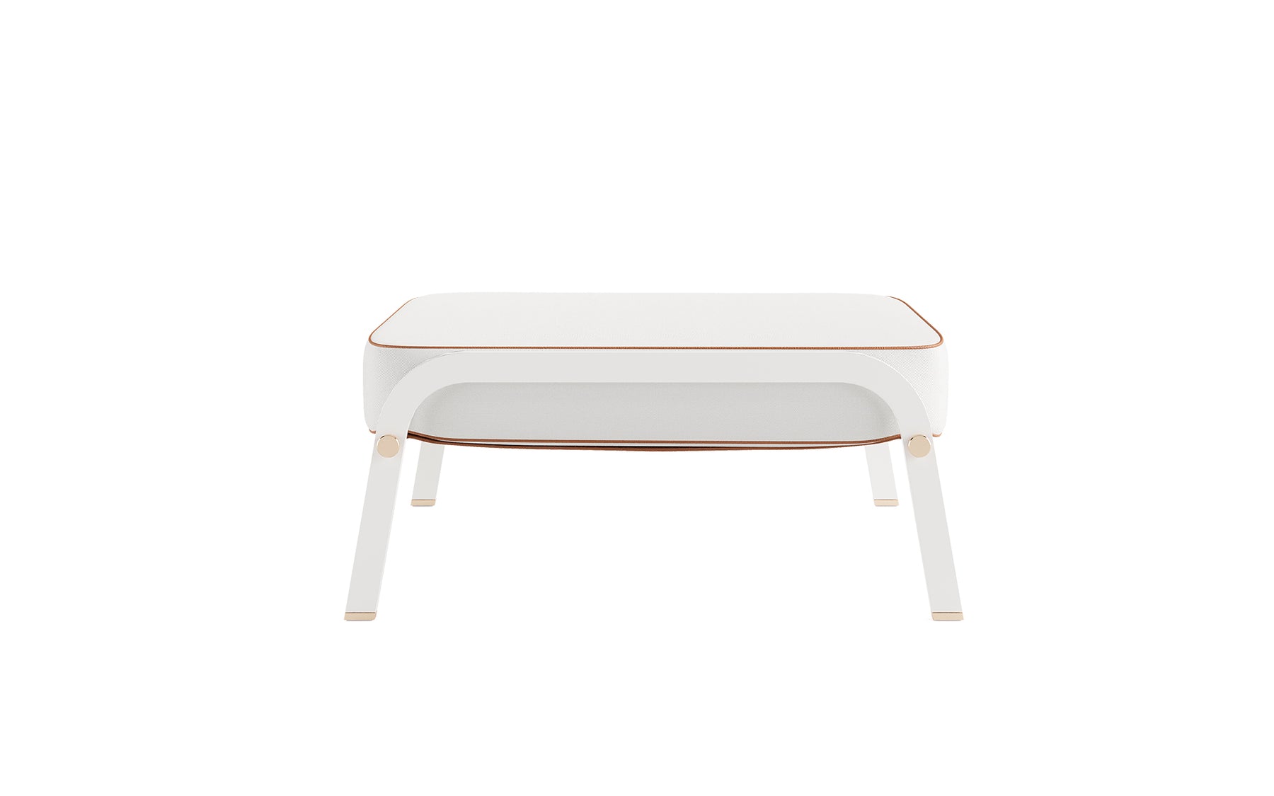 Structure: White aluminum lacquered • Metallic details: Gold plated stainless steel • Upholstery: Acrylic fabric • Pipping: Outdoor leather • Straps: Outdoor Leather