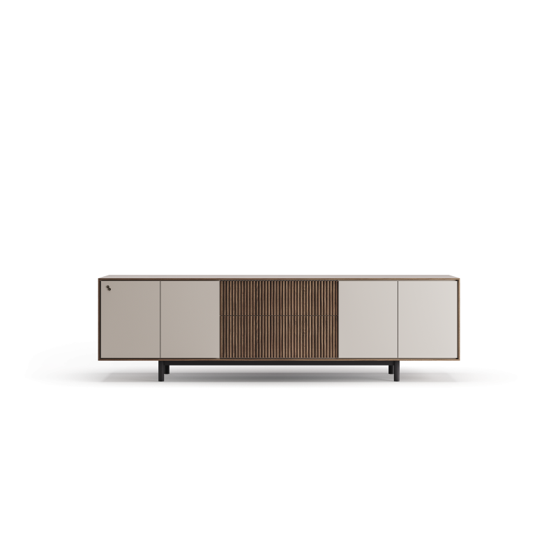 Está revestido con chapa de roble trenzada y contiene 4 puertas y un cajón con tirador de acero inoxidable.