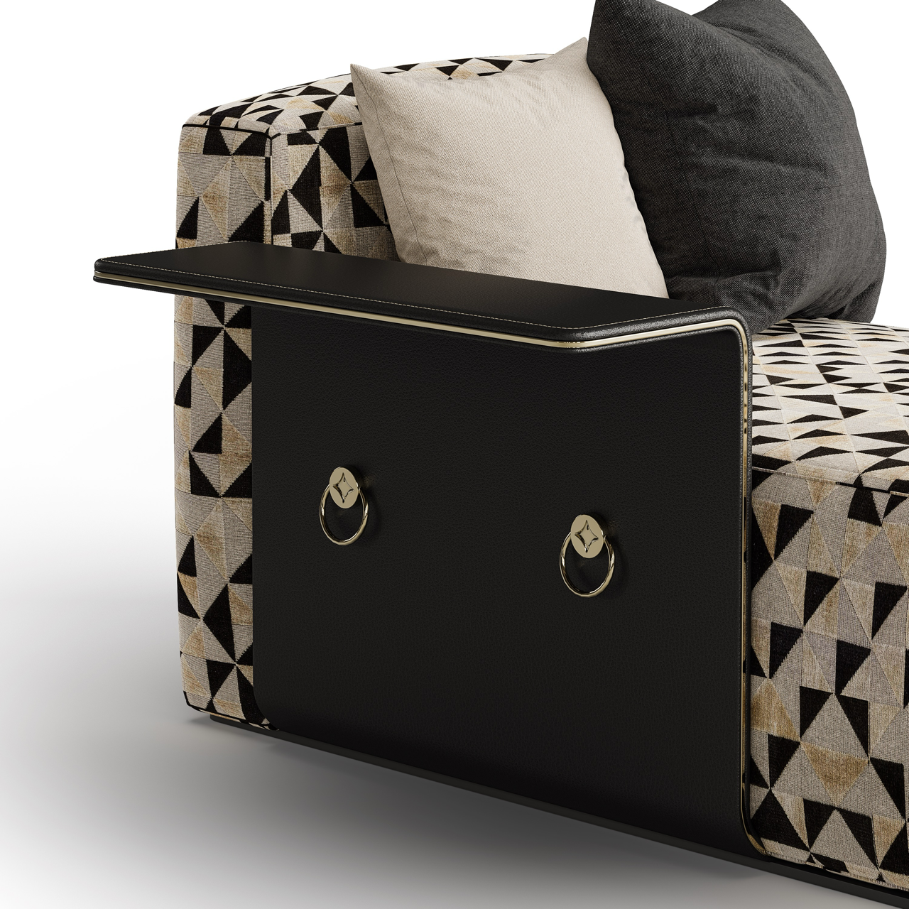 The geometric patterns of its fabric echo the chaotic spontaneity of the movement, while the sleek integration of its natural leather side panel, complete with gold-plated hardware, nods to Dada’s fusion of art and practicality.